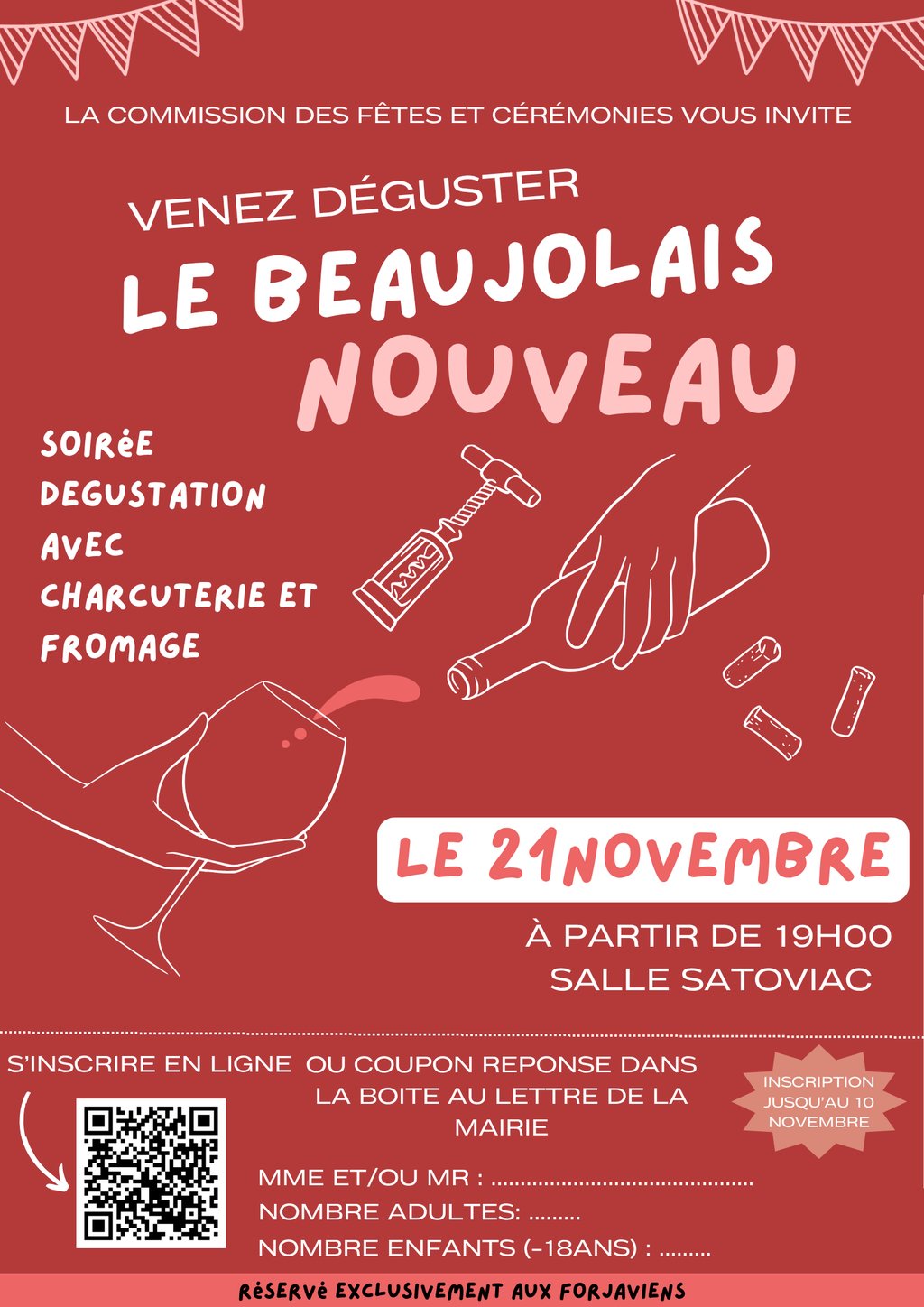 La Commission FĂȘtes et CĂ©rĂ©monies a le plaisir de vous inviter Ă une soirĂ©e exceptionnelle placĂ©e sous le signe de la convivialitĂ©, du partage⊠et du Beaujolais Nouveau !