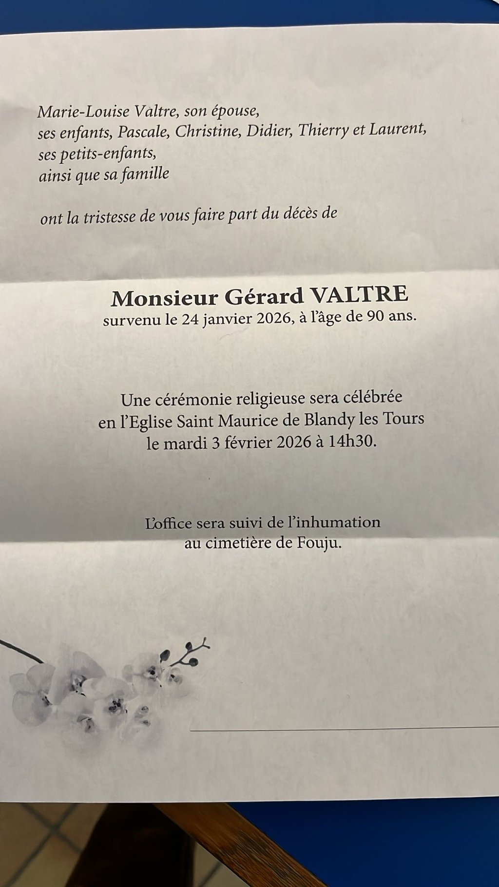 La cérémonie religieuse aura lieu demain à 14h30 en l’église de Blandy-les-Tours, suivie de l’inhumation au cimetière de Fouju.
