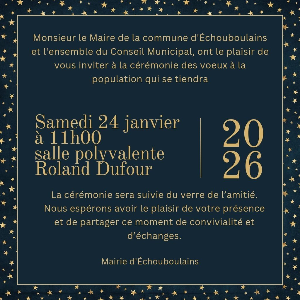 Monsieur le Maire et l'ensemble du Conseil municipal ont le plaisir de vous inviter Ă la cĂ©rĂ©monie des vĆux Ă la population qui se tiendra Samedi 24 janvier 2026 Ă 11h00 dans la salle polyvalente Roland Dufour.