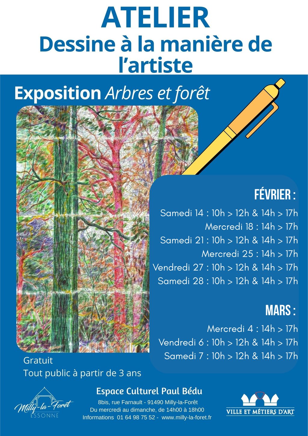 À l’occasion de l’exposition « Arbres et Forêt » à l’Espace culturel Paul Bédu, les enfants à partir de 3 ans sont invités à participer à des ateliers de dessin inspirés de l’univers fascinant des arbres et de la forêt de l'exposition en cours.